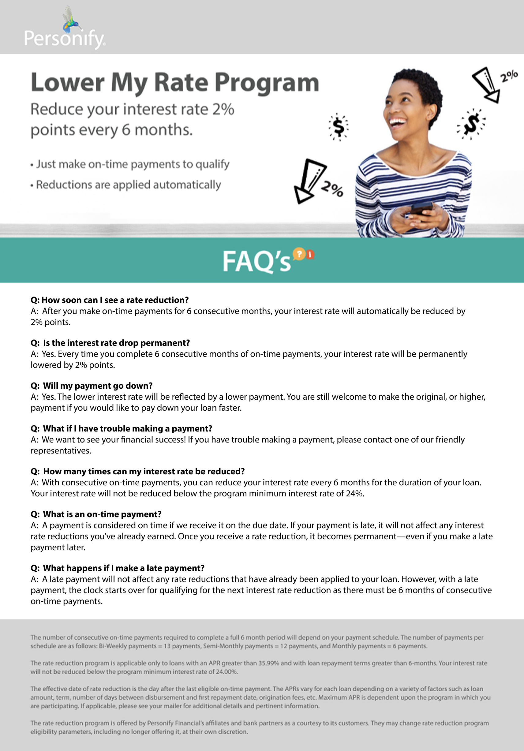A: With consecutive on-time payments, you can reduce your interest rate every 6 months for the duration of your loan. Your interest rate will not be reduced below the program minimum interest rate of 24%.